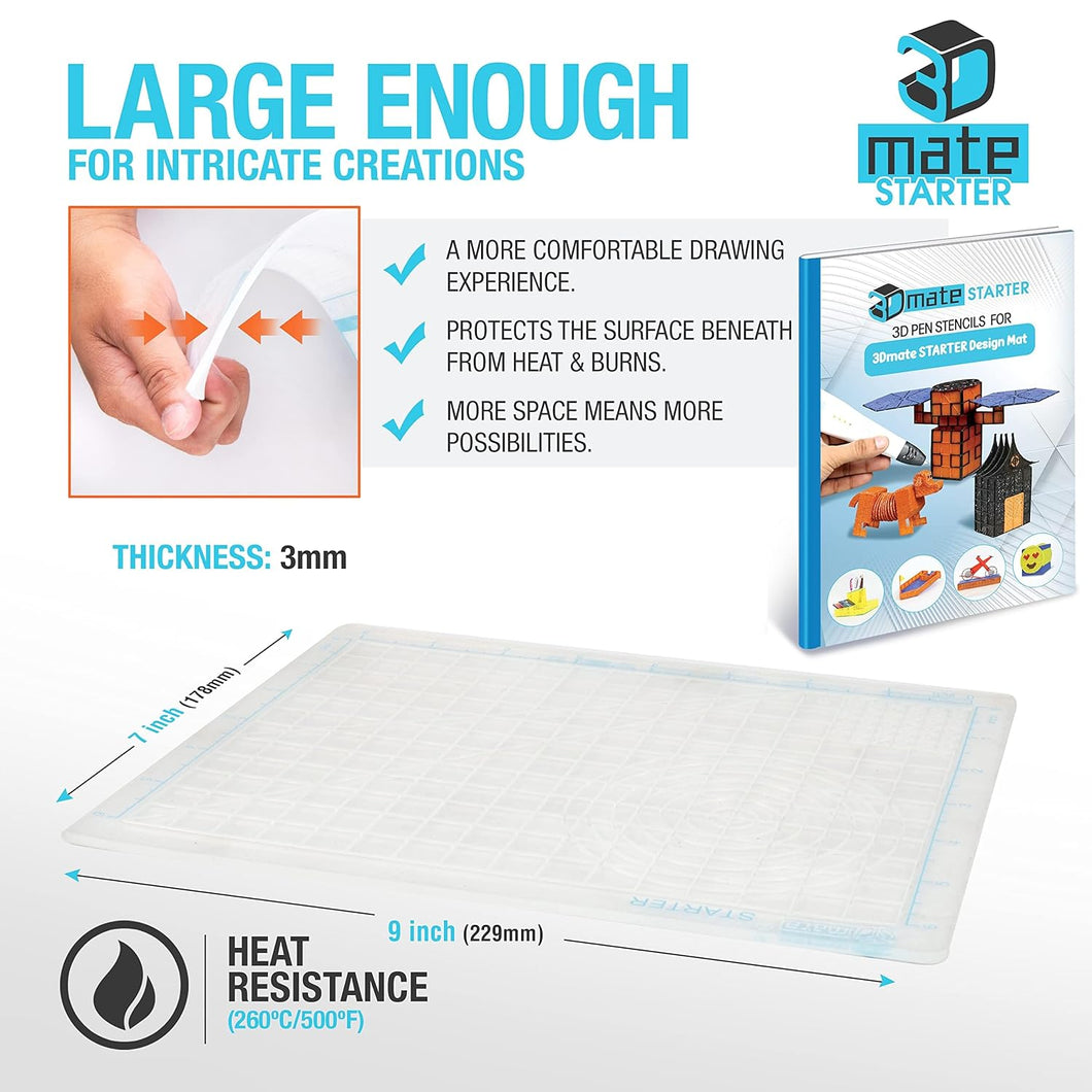 • ✅ Innovative 3Dmate Starter Mat: 3Dmate 7x9 inches heat-resistant silicone mat with 3mm thickness features a smooth side and a grooved side for enhanced precision and control. Its transparent design allows easy template placement for accurate tracing. Simply bend the mat to release cooled filament creations effortlessly.